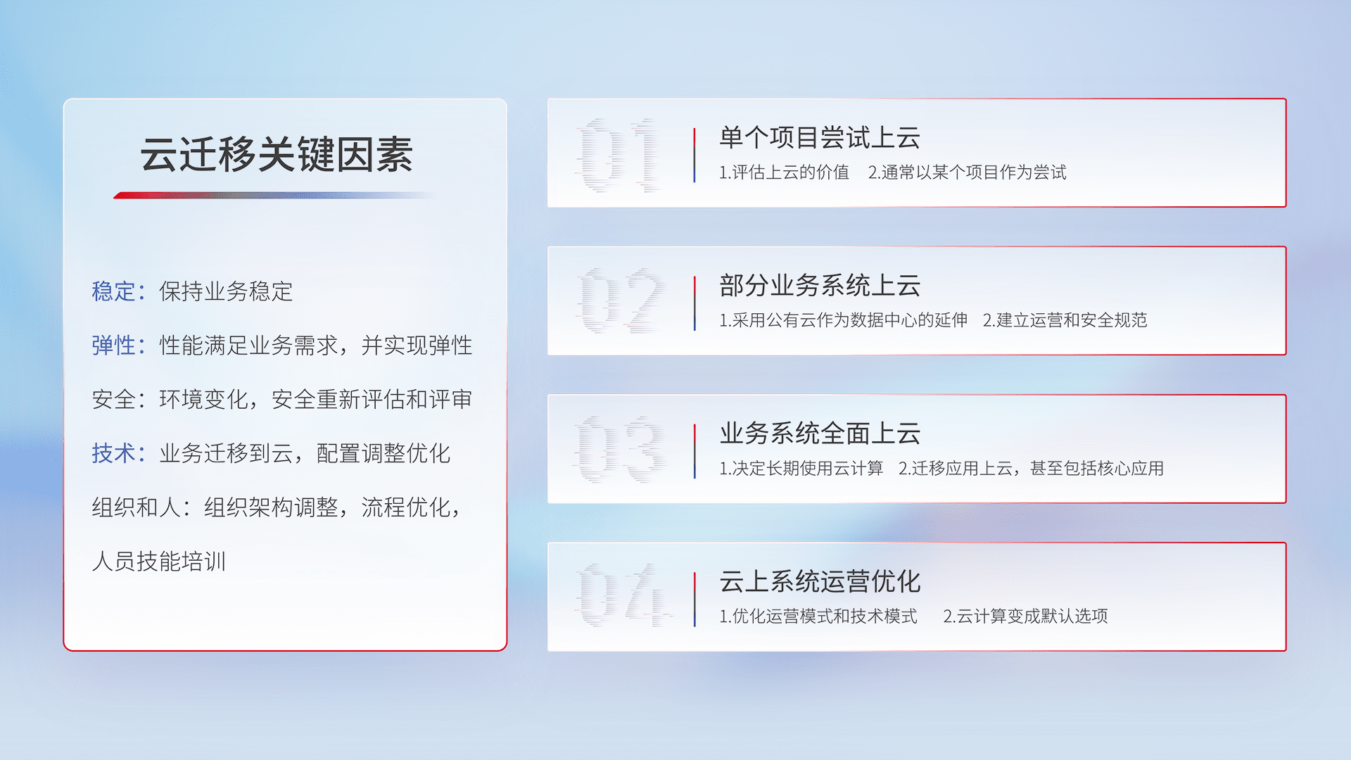 结合实际业务,,从规划设计、、云平台选型、、云原生改造、、数据迁移、、、集成交付,,迁移全过程为客户识别最佳上云路径,,,,做好风险识别管理,,,,设计网络架构、、、、身份权限、、安全审计合规、、、、操作审计、、日志审计、、、监控告警策略、、、多站点容灾设计等,,对云上基础设施进行整体规划,,,,提升IT治理水平,,以满足弹性、、高可用、、、、高性能的需求。。。。