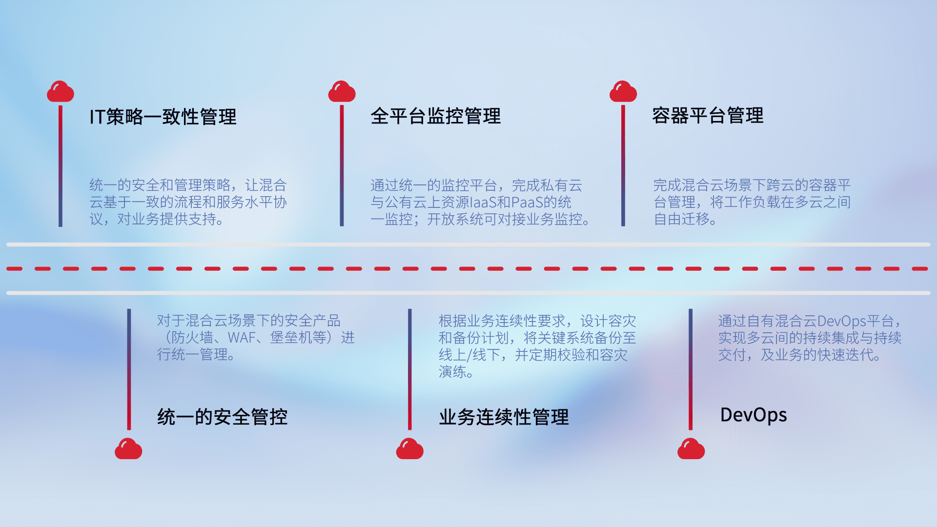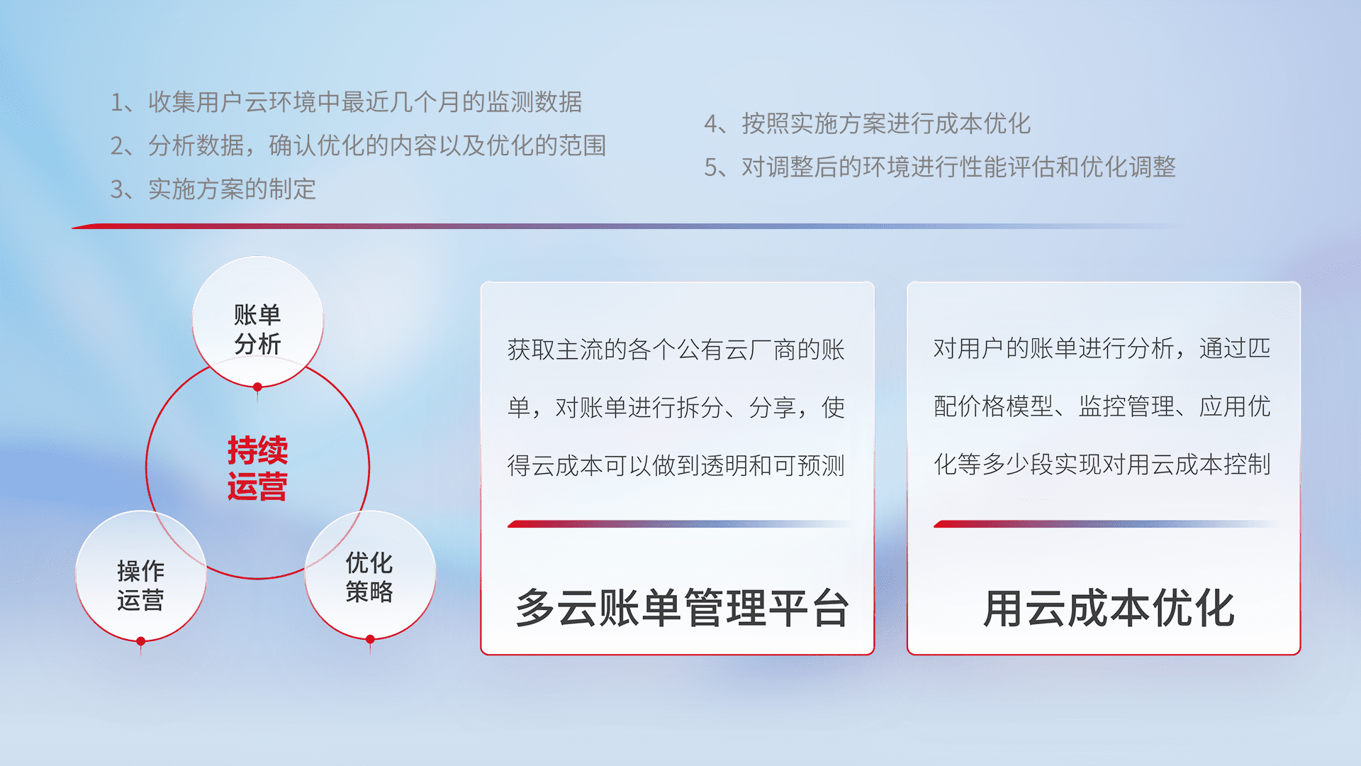 通过多云纳管,,,,以统一的资源数据模型把客户的云资源进行抽象和封装,,,进而实现对多云资源的统一操作,,,保障云资源管理的可靠性、、稳定性与可用性。。。量身定制化运维内容,,配置、、、、开发运维、、补丁管理、、、备份、、、、监控、、、、认证和访问管理、、审计和日常巡检等,,,,保障在用云过程中的可靠度,,,稳定度以及高可用率。。。